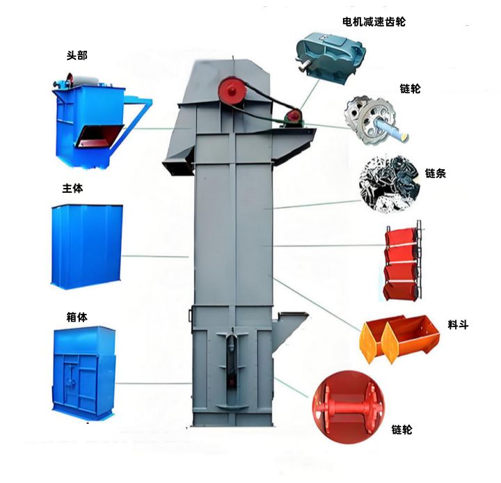牽引構(gòu)件:包括鏈條、板鏈或環(huán)鏈,是帶動料斗循環(huán)運行的關(guān)鍵部件,直接影響提升能力和使用壽命。