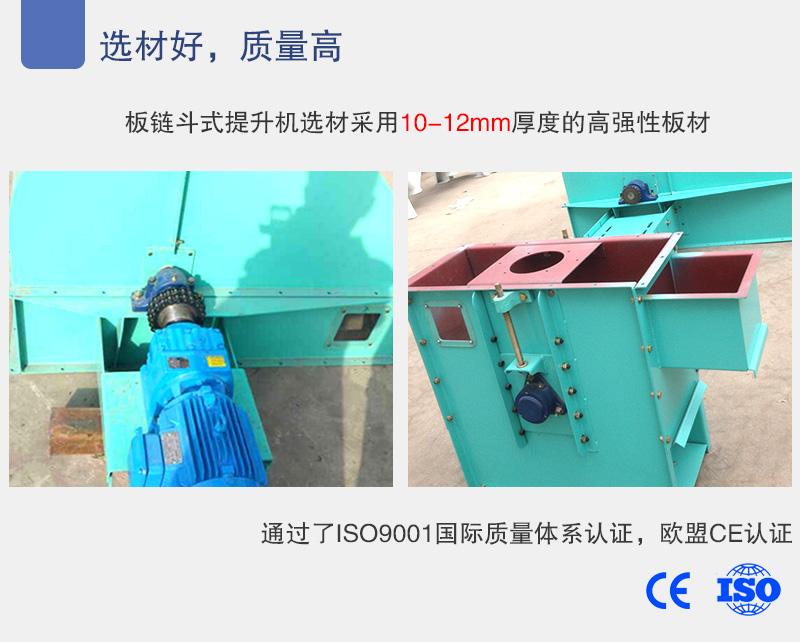 設(shè)備質(zhì)量的好壞直接影響其工作效率,板鏈斗式提升機(jī)選材采用10-12mm厚度的高強(qiáng)性板材,產(chǎn)品不合格不出廠,我們生產(chǎn)的板鏈斗式提升機(jī)通過了ISO9001國(guó)際質(zhì)量體系認(rèn)證,歐盟CE認(rèn)證,廠家承諾如果我們的產(chǎn)品在售出后30天出現(xiàn)問題可以免費(fèi)退換。