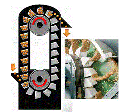 利用離心力將物料甩出卸料口。適用于提升速度快、干燥、小顆粒的場(chǎng)合。料斗的速度比較高,一般為每米1-2秒,要保持這個(gè)速度,必須選擇正確的驅(qū)動(dòng)輪,速度和直徑尤為重要,卸料口的選擇不容忽視。