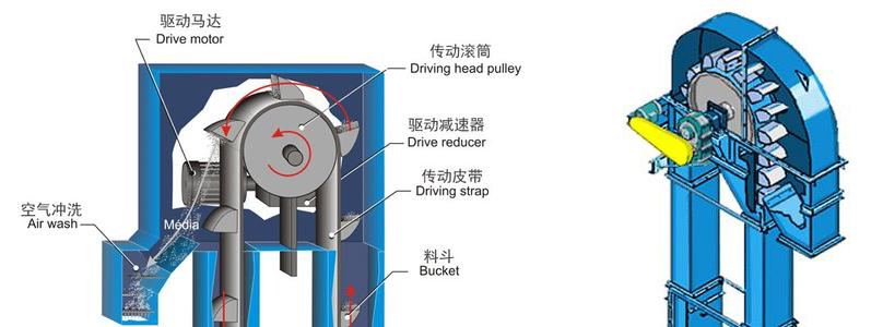 優(yōu)點(diǎn):在相同料斗速度下,驅(qū)動(dòng)輪尺寸小,卸料位置高,各料斗間距減小,可增加卸料管高度,機(jī)器高度降低。