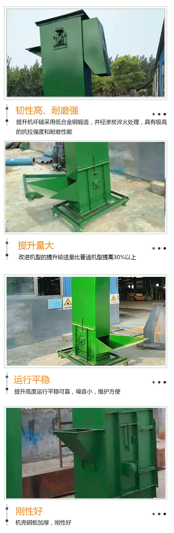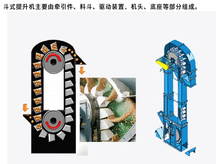 環(huán)鏈斗式提升機(jī)主要是依靠固定在鏈條上的料斗,將均勻流入尾部進(jìn)料口的物料從斗式提升機(jī)尾部不間斷地提升到斗式提升機(jī)頭部,并 然后從機(jī)頭出口卸下物料,完成整個(gè)物料提升過(guò)程。適合輸送堆積密度小于1.5t/m³易于掏取的粉狀、粒狀、小塊狀的低磨琢性物料 ,如:煤、水泥、碎石、砂子、化肥等,比普通機(jī)型提高30%以上。
