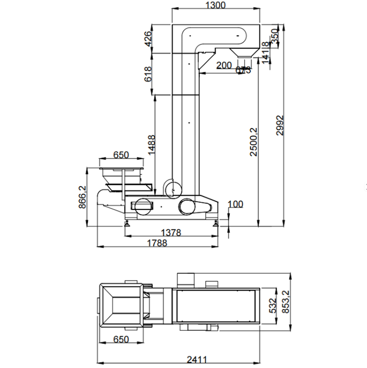 鏈條式Z型輸送機通常配備板鏈或附件鏈條,較高的承載能力和抗沖擊性能。輸送高度范圍可達2-15米以上,常用鏈條寬度為300–600mm,載重能力可達2t/h以上,適用于生產線負荷大、袋體較重或大容量液體袋的液體包裝場景。