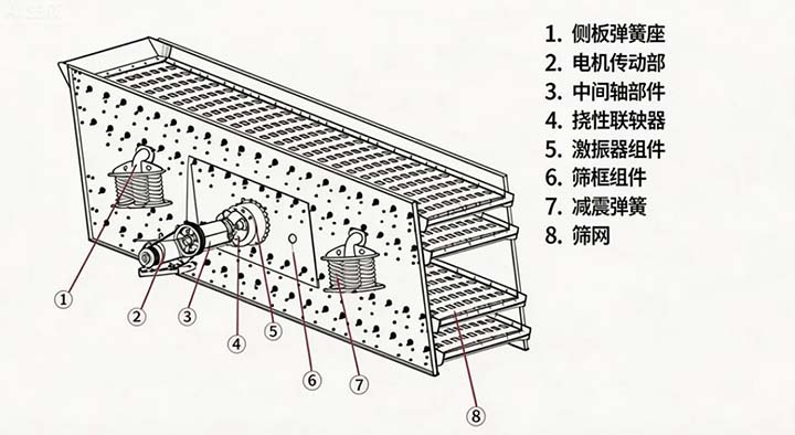 0715型礦用重型振動篩有篩箱、振動電機、減振系統及底架等組成。篩箱由篩框、篩板、襯板等組成。篩機側板采用優質鋼板制作而成,側板與橫梁、激振器底座采用高強度螺栓或環槽鉚釘連接,結構合理,堅固耐用。